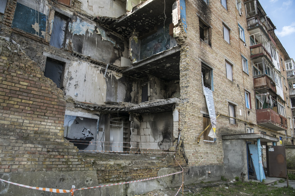 Graffiti światowej sławy artysty ulicznego Banksy'ego na ścianie zniszczonego budynku w ukraińskiej wsi Horenka